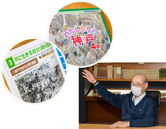 近年、賀川豊彦の活動が見直され、神戸市の小学4年生が授業で学んでいます。さらに学習を深めるために賀川記念館に見学に来られたり、私たちが学校に出向いて話をするなどの協力をしています。「私たちの住む神戸にこんな歴史があったなんて」「自分にも何かできることはないだろうか」など、子どもたちの感想文を読むと胸が熱くなりますね。